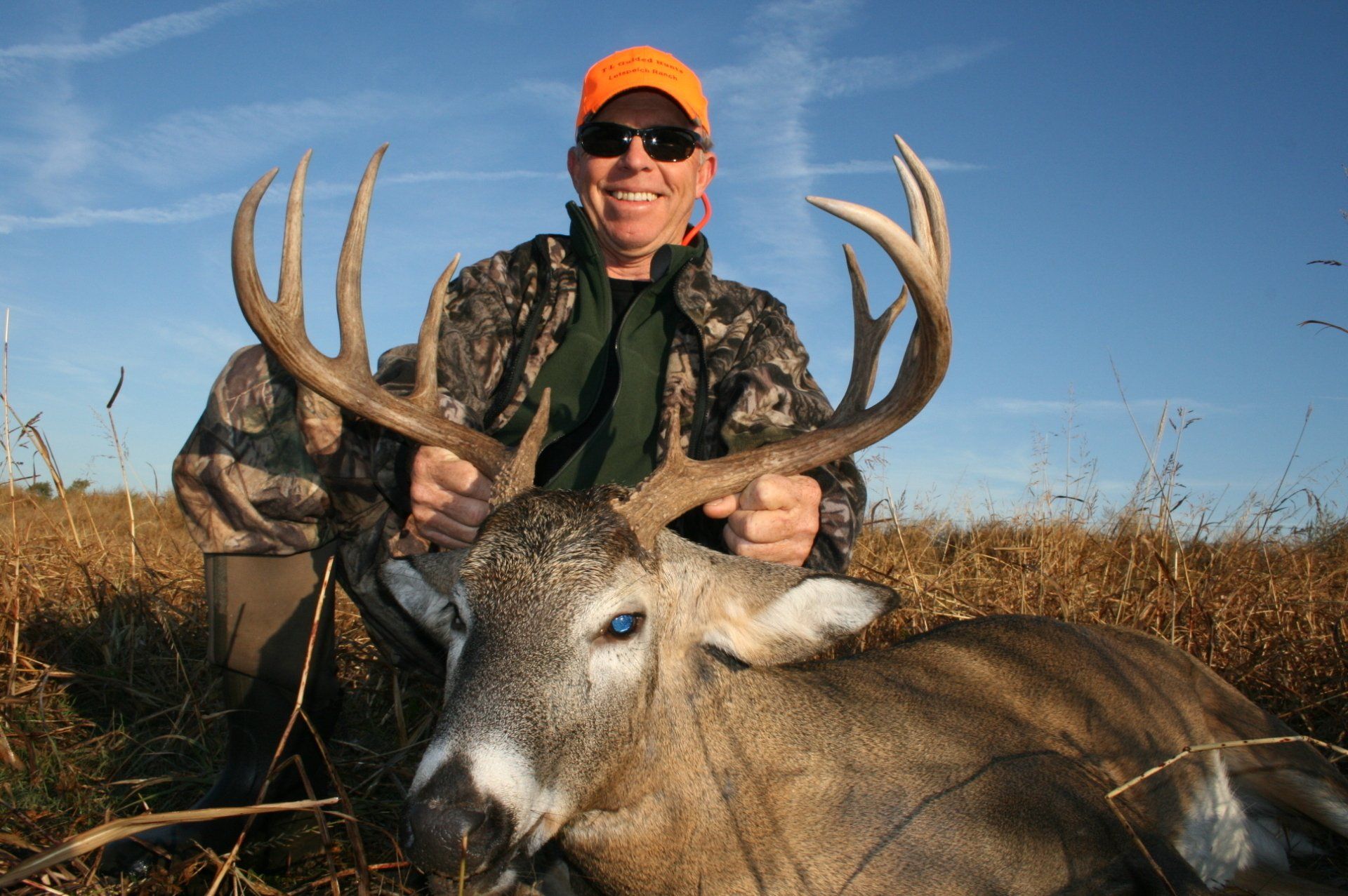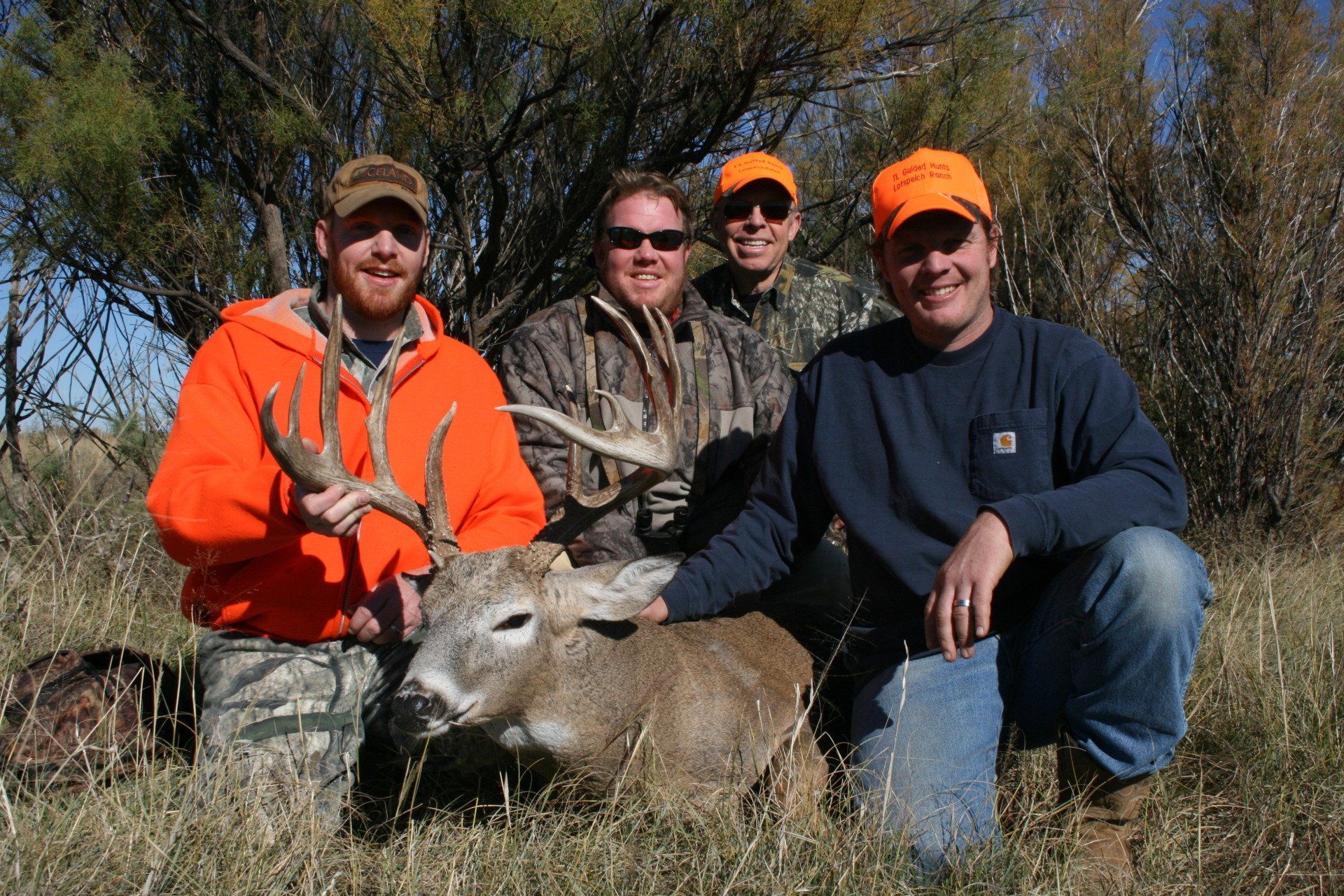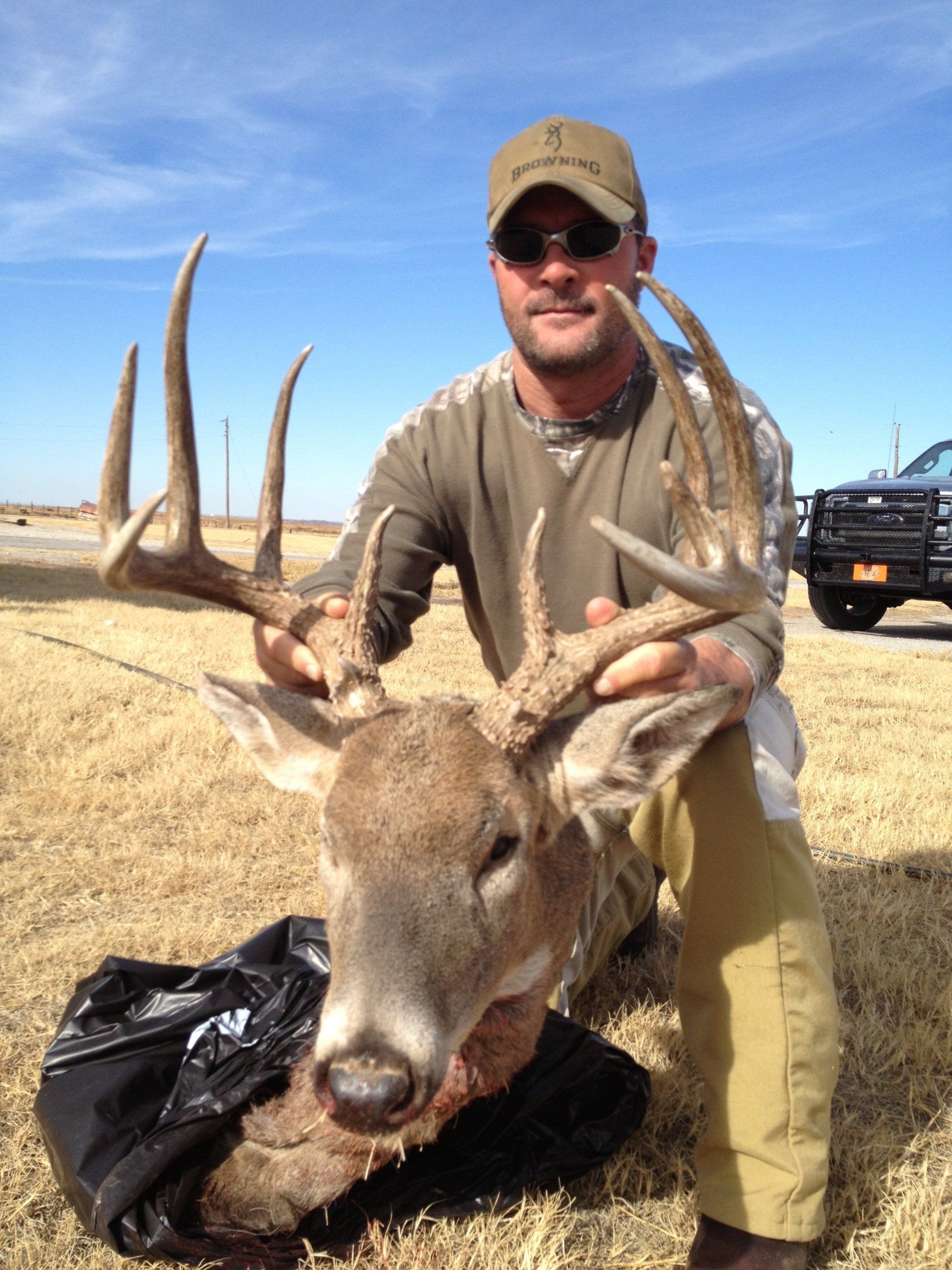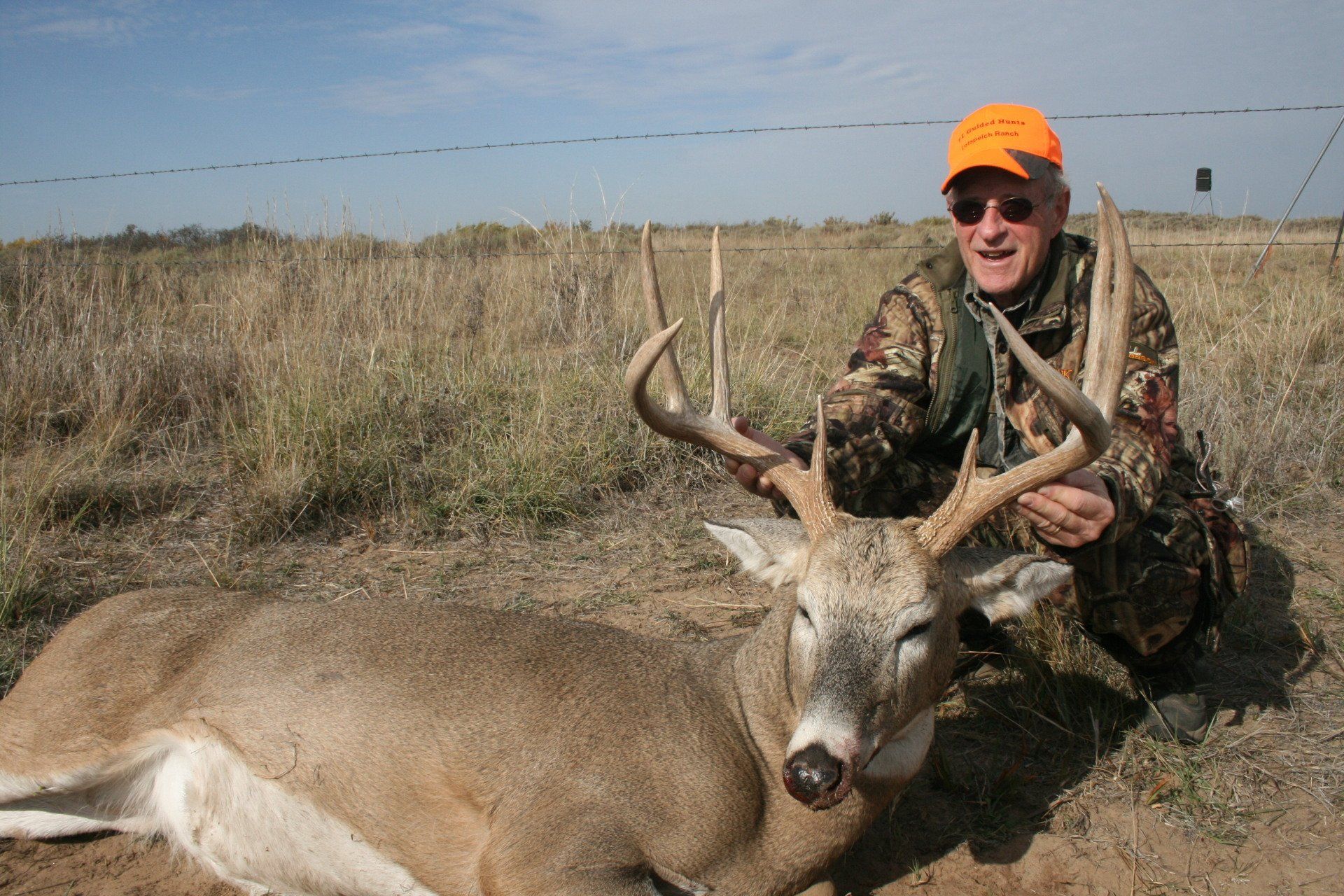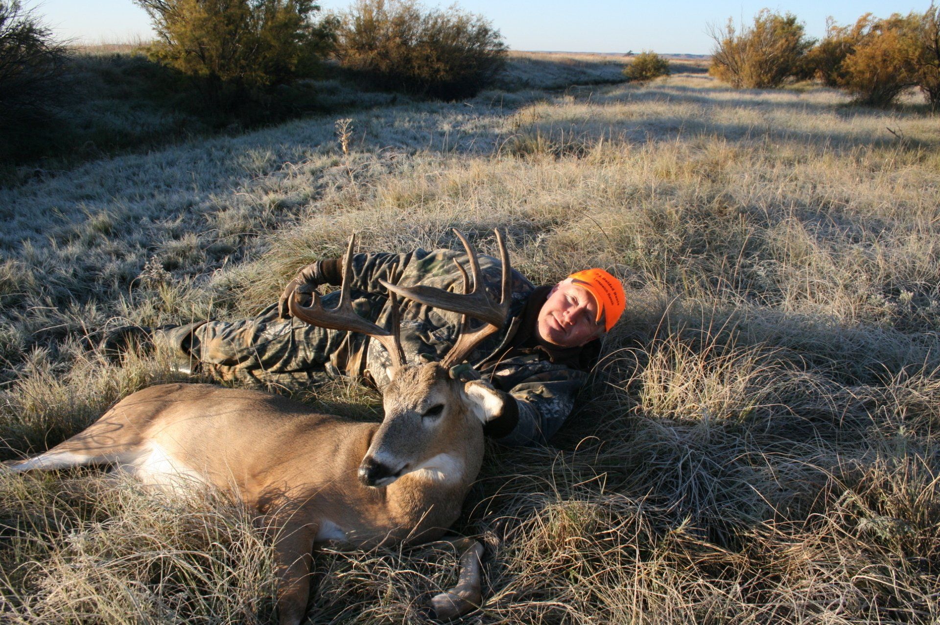 The south side has much of the same with more brushy cover and a joining acres of wheat, alfalfa, and milo fields. The are no through roads and only 2 access roads to the ranch. This makes a nice refuge in deer paradise. The ranch has been leased to one person for fifteen years taking only mature whitetail bucks. We are doing limited hunts on the ranch so call and book early.