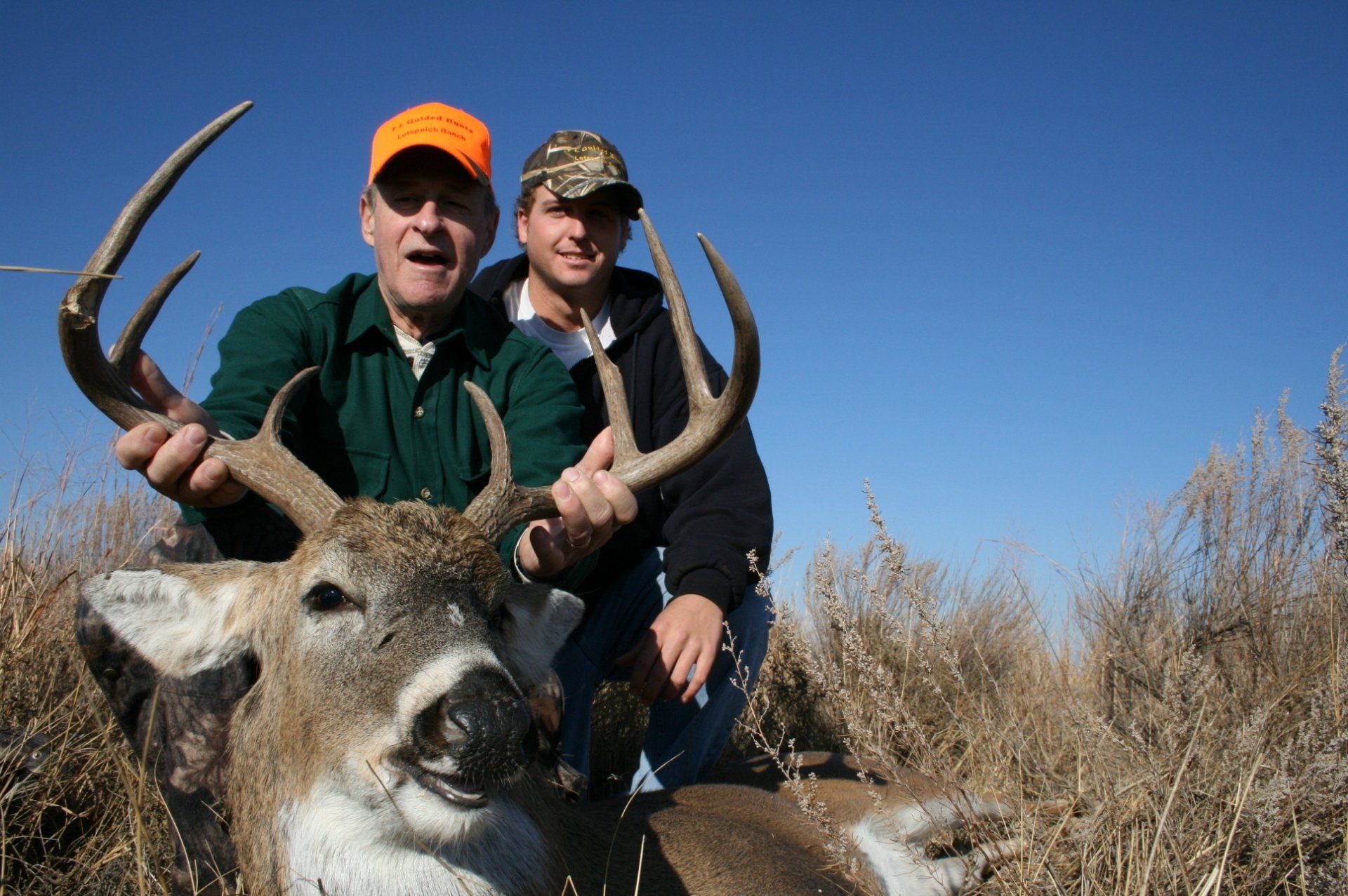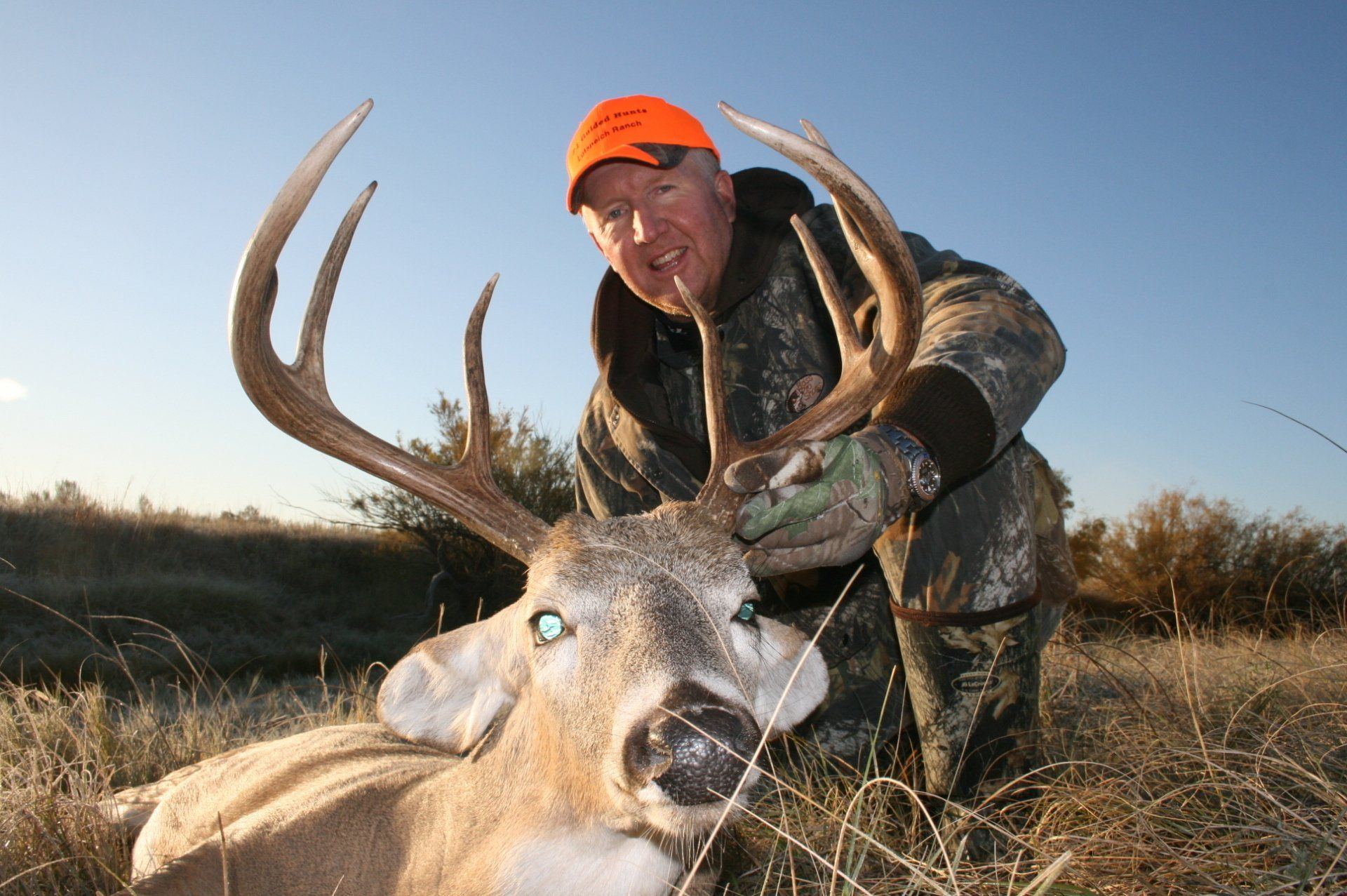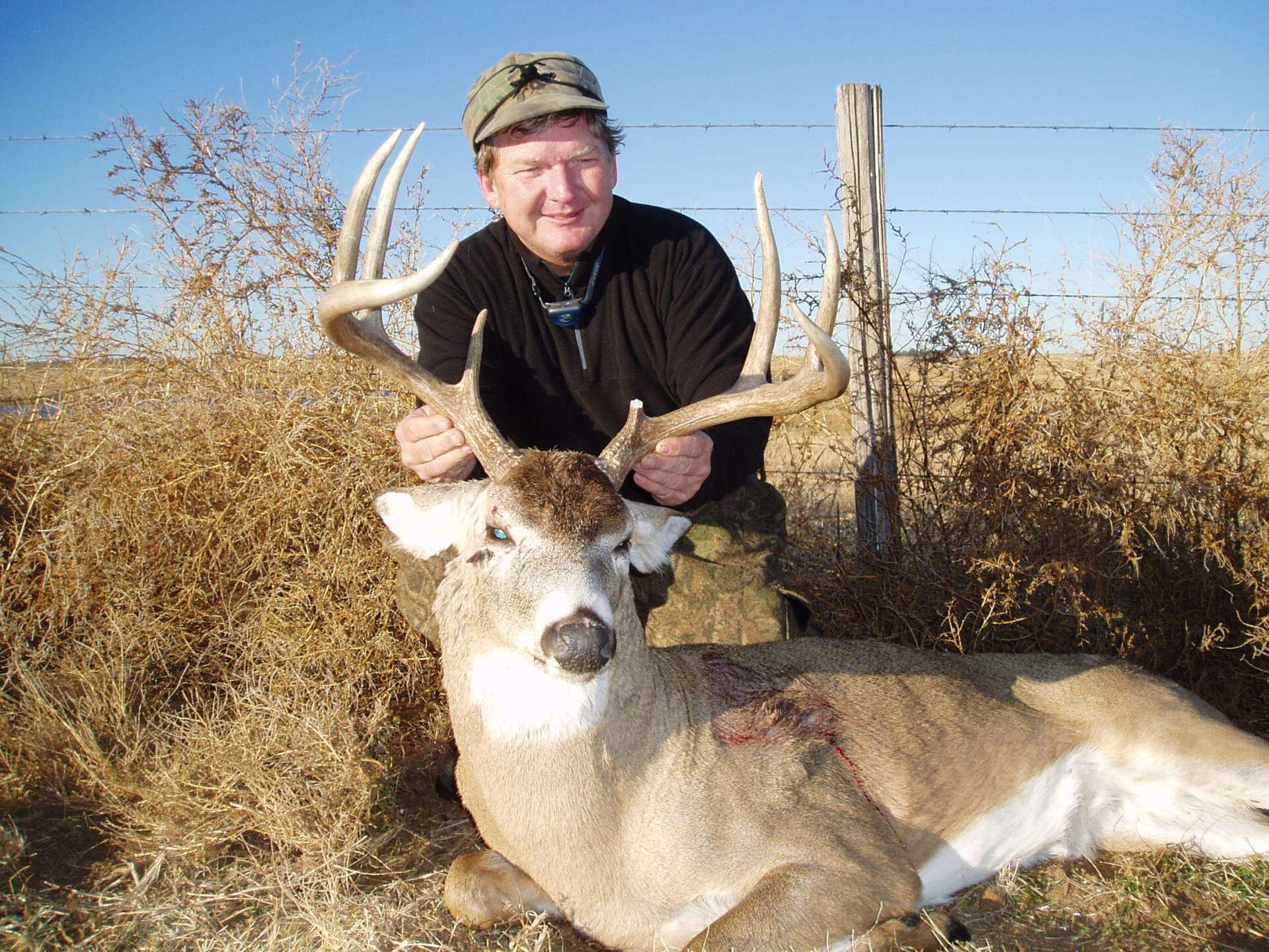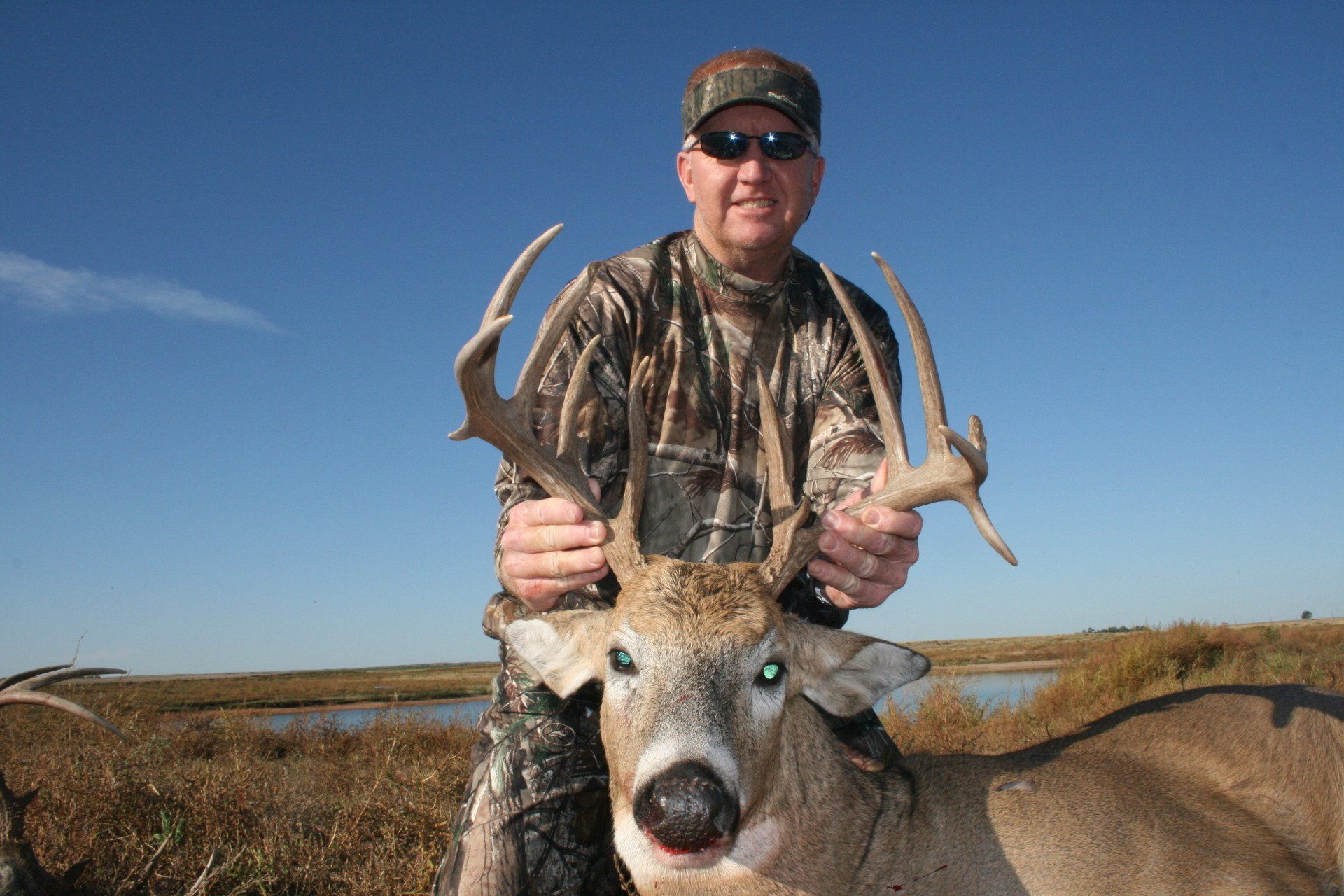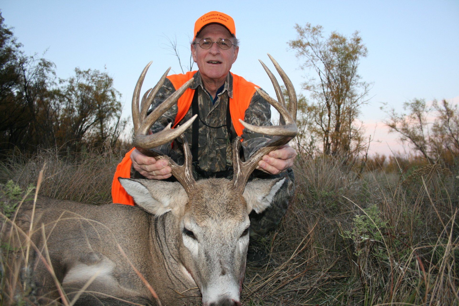 The south side has much of the same with more brushy cover and a joining acres of wheat, alfalfa, and milo fields. The are no through roads and only 2 access roads to the ranch. This makes a nice refuge in deer paradise. The ranch has been leased to one person for fifteen years taking only mature whitetail bucks. We are doing limited hunts on the ranch so call and book early.
